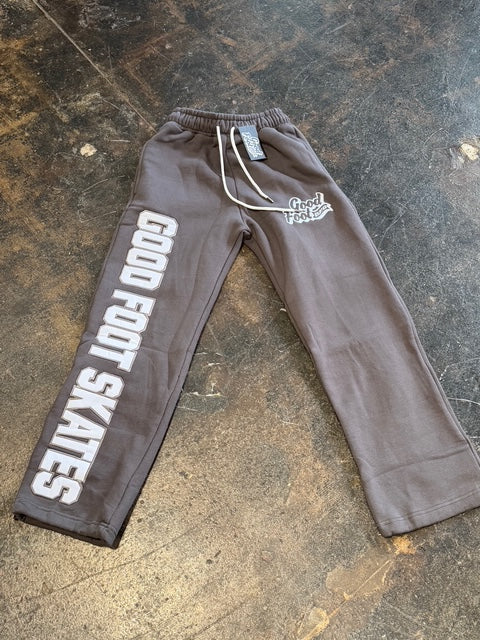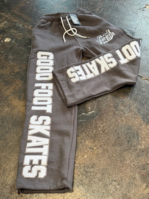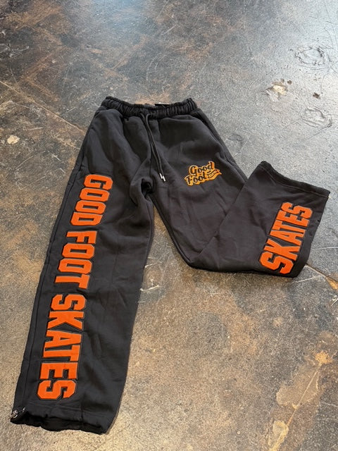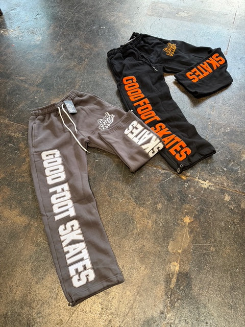 The Essential Sweatpant is crafted from high gsm heavy fleece and comes in a rich dark black or a deep grey. Its wide-leg silhouette is defined by a bold “Good Foot Skates” applique logo on the front and back of the legs with an embroidered logo at the thigh. Finishing details include an encased elastic waistband with elongated drawcords, and side seam pockets.